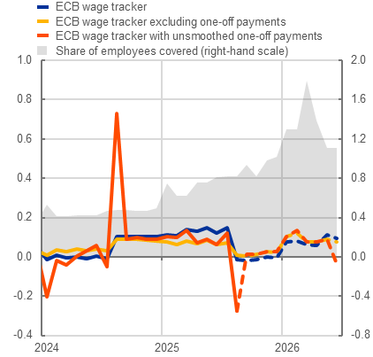- The ECB wage tracker with unsmoothed one-off payments is constructed on the basis of a methodology that, in terms of both data sources and statistical methodology, is conceptually similar to, but not necessarily the same as, that used for the indicator of negotiated wage growth.