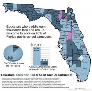Hickmon’s analysis found that prohibitions against school paddling are now the norm on Florida’s public school campuses. “Paddling is allowed in around half of Florida counties,” Hickmon said; “but while districts that spank occupy ample space on the map, they tend to be located in sparsely populated areas, with fewer schools and mostly lower paying teaching jobs.”