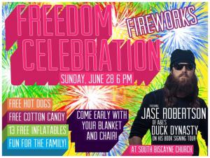 NORTH PORT, FL, USA, June 16, 2014 /EINPresswire.com/ -- North Port, FL - June 2, 2014 -- Jase Robertson, one of the stars of A&E's hit TV series Duck Dynasty, is coming to South Biscayne Church on his book signing tour for a Freedom Celebration. There will be free hot dogs and cotton candy, 13 free inflatables, fireworks, and fun for the whole family!Growing up with his father as the Duck Commander, Jase Robertson soon realized that if he wanted to spend time with him, he'd have to meet him in the blind.