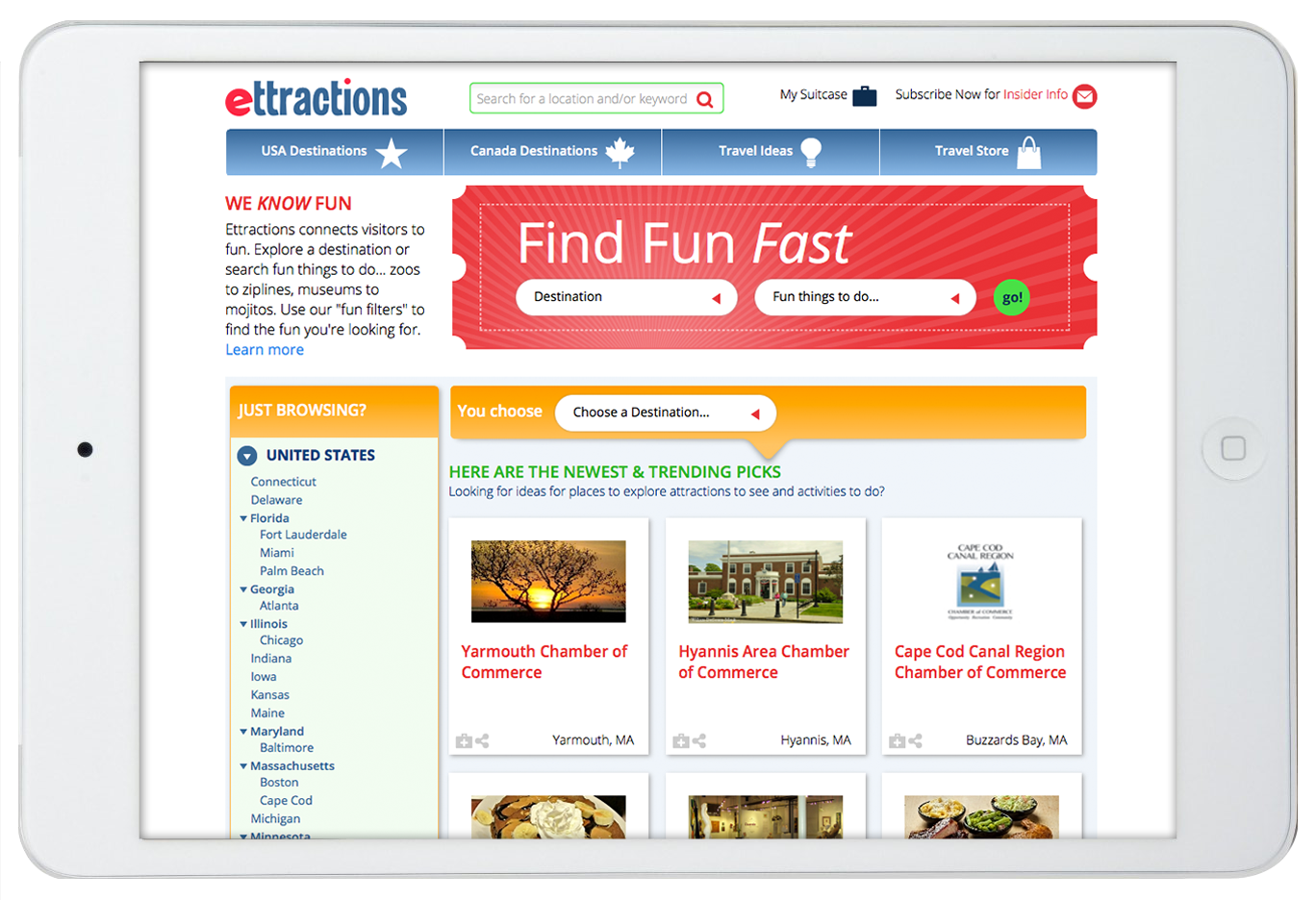 The growth of the Ettractions digital platform is celebrated today less than 3 years from their first touch screen installation at Bass Pro Shops Outdoor World in Foxborough, Massachusetts. Well received by host location partners and visitors alike, Ettractions ExploreBoard has grown to include over 40 networks in 15 states and provinces in North America. More than 600 tourism clients utilize Ettractions digital marketing solution to promote their business to visitors.
