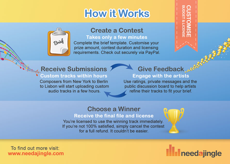 The service works around an open contest platform where composers, music producers and recording artists from around the world submit original tracks for consideration in paid media productions and other projects. The winning artist receives the licensing fee (or 'prize') set out by the contest holder (the client).