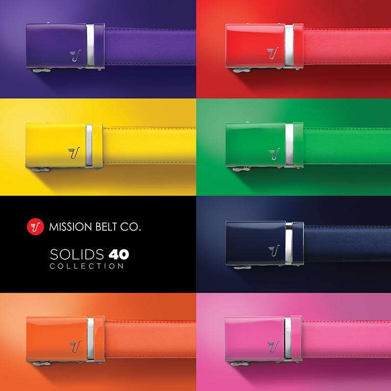 PROVO, UTAH, UNITED STATES, August 21, 2014 /EINPresswire.com/ -- Mission Belt Co. , the company dedicated to making world class, no-hole leather belts and aggressively fighting global hunger through Kiva loans, introduces the new SOLIDS 40 collection that features an array of vibrantly colored belts.“As we continue to trail blaze the belt market, we want to give customers more variety than the traditional colors previously offered so we launched the SOLIDS 40 collection,” said Nate Holzapfel, cofounder of Mission Belt Co. “This bright line of colored belts is perfect to add just a touch of color to any outfit during the dog days of summer. Particularly, the line will really appeal to our golf audience as they hit the course in style and color.”