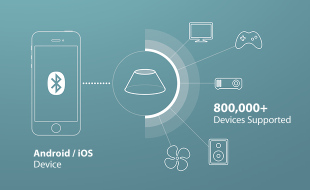 The AnyMote home is small, unobtrusive and can be placed anywhere in the same room with the devices it will control. It is operated from a Smartphone or Tablet using the Smart IR Remote application. Enter the devices you want to control with the program, and set up a variety of protocols so that all you need to do for a particular activity is to hit one button on your phone or tablet. AnyMote will take care of the rest. It even has a “Welcome Home” mode that automatically activates when you walk in the door with your device.