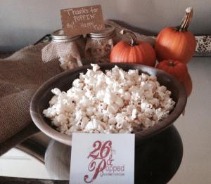 $100 – Five large bags of gourmet popcorn, a 26th & Popped tee shirt, personalized note to you and thank you on website sponsor page
