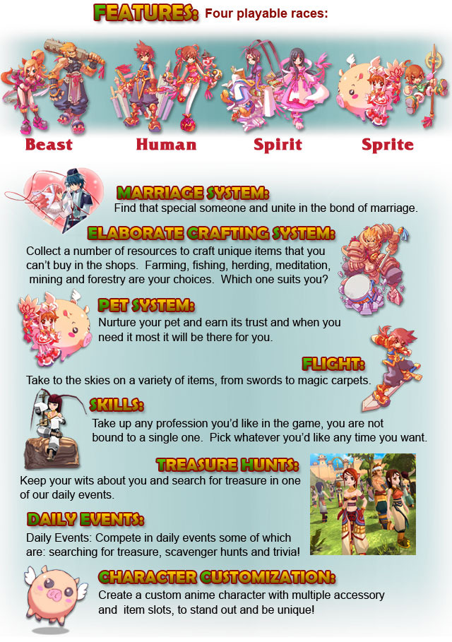 Gameplay in DOMO is very much team-based. One of the guiding characteristics is the ability to link with another person, developing a relationship that will benefit both players. The relationships can vary – friendship, parent/child, teacher/student, even marriage. It is rumored that in the new version, same sex character marriages will be allowed. Players can also acquire pets to nurture – some of which grow into beings that can be ridden. Characters can use flying machines to get around in the game world, and they can create items. These range from magical flying swords and carpets to mechanical devices. Of course, there are monsters and sometimes even other players with whom to battle. There are also daily events, including treasure hunts and other group participation opportunities. If that isn’t enough to entice serious gamers, the characters are customizable, with many slots for upgrades and costume changes.