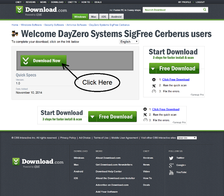 The CNET download is available at http://download.cnet.com/DayZero-Systems-SigFree-Cerberus/3000-2239_4-76200909.html?part=dl-&subj=dl&tag=button and can also be found on the Cerberus product page.