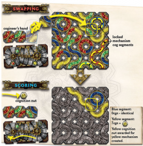 Game equipment includes color tiles, marker pieces, scoreboards and a copy of the game rules – as well as a cogged device that tracks the number of turns until the Mad Professor’s return – a number that varies with the number of players.