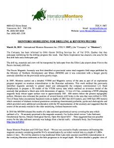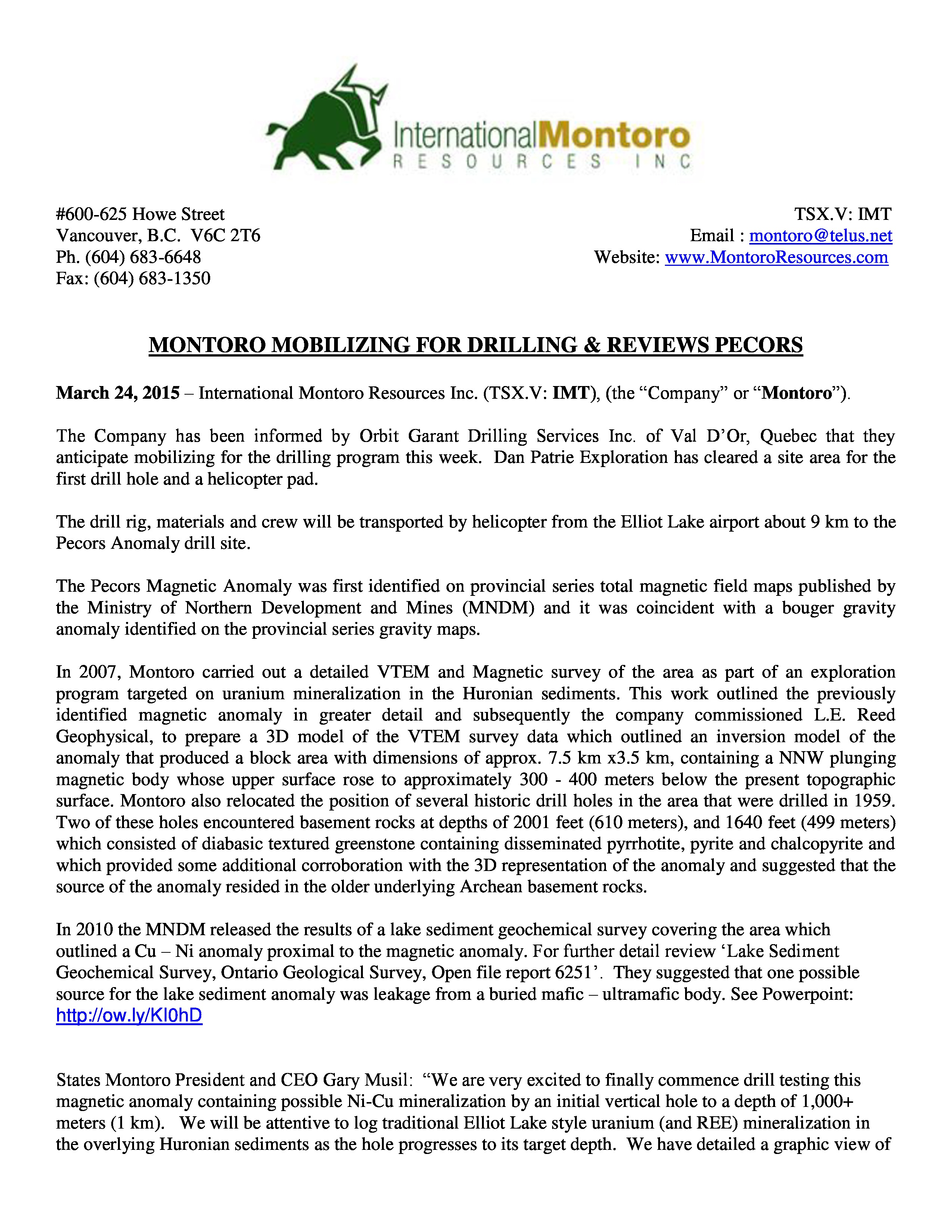 March DRAFT, 2015 – International Montoro Resources Inc. (TSX.V: IMT), (the “Company” or “Montoro”).
