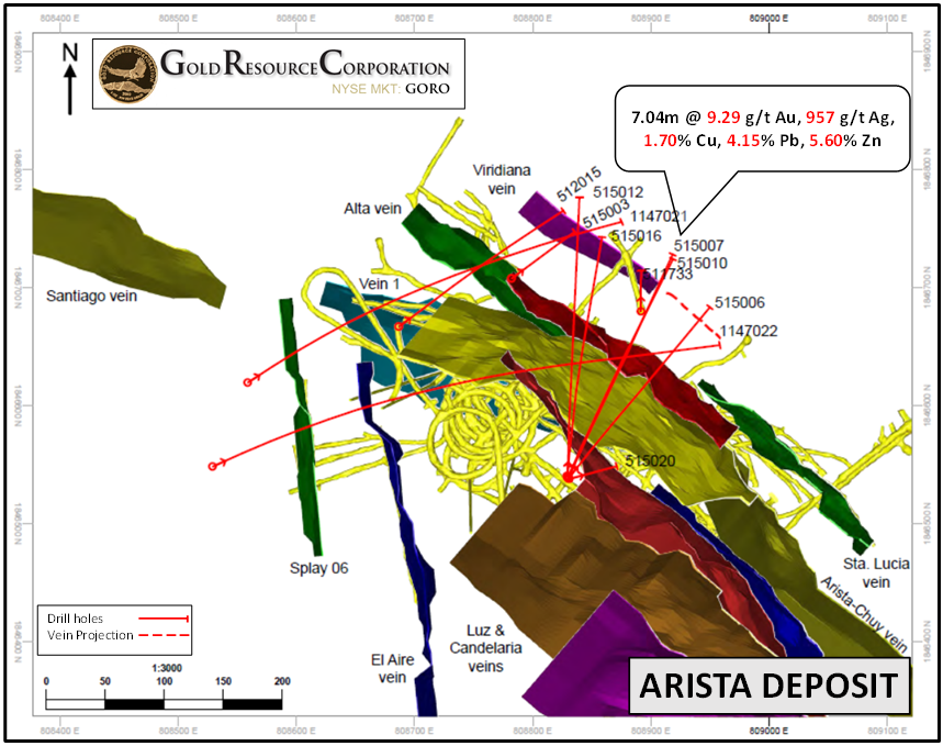 "It is exciting to discover additional high-grade veins while expanding mineralization on known veins, like Vein 1 and Vein 3, at the Arista deposit," said Gold Resource Corporation's Vice President of Exploration, Mr. Barry Devlin. "The Viridiana vein's 7.04 meters of 9.29 grams per tonne gold, 957 grams per tonne silver, 1.70 percent copper, 4.15 percent lead and 5.60 percent zinc, in addition to other newly discovered high-grade veins near Viridiana, speak to the Arista deposit's growth and potential. We look forward to testing additional extensions at Arista, delineation and expansion to our Switchback discovery and Alta Gracia property, and other new targets along our 55 kilometer mineralized corridor."