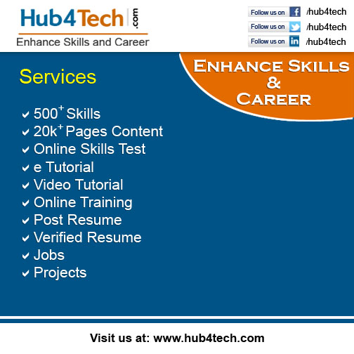 Hub4Tech.com provides Online Skill Test, Tutorials, Video Tutorial, Online Training and Resume Analytics Service.