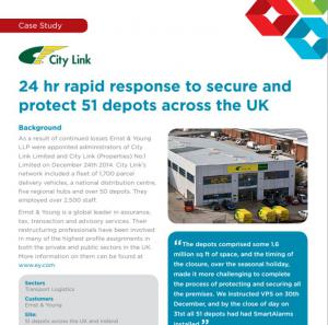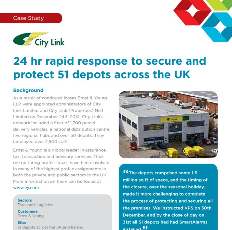 LONDON, UNITED KINGDOM, July 9, 2015 /EINPresswire.com/ -- On New Year’s Eve, 2014, administrators Ernst and Young (EY) called vacant property specialists VPS after a major parcel courier collapsed leaving 1.6 million square feet of space unprotected, 30,000 undelivered parcels and 51 depots around the UK.VPS, secured and alarmed the City Link depots, stretching from Aberdeen to Southampton, within 24 hours of receiving the instruction from EY, and have issued today a case study that outlines the method and reasons for choosing the solution implemented.