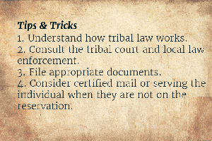 ‘Process server and veteran Private Investigator Ralph Jones advises, “If you don’t check-in with the local law enforcement and/or tribal police before attempting service you are making it doubly hard on yourself. Acquaint yourself with the tribal court and tribal police at the very beginning and then you can usually count on their help in successfully serving the individual.”