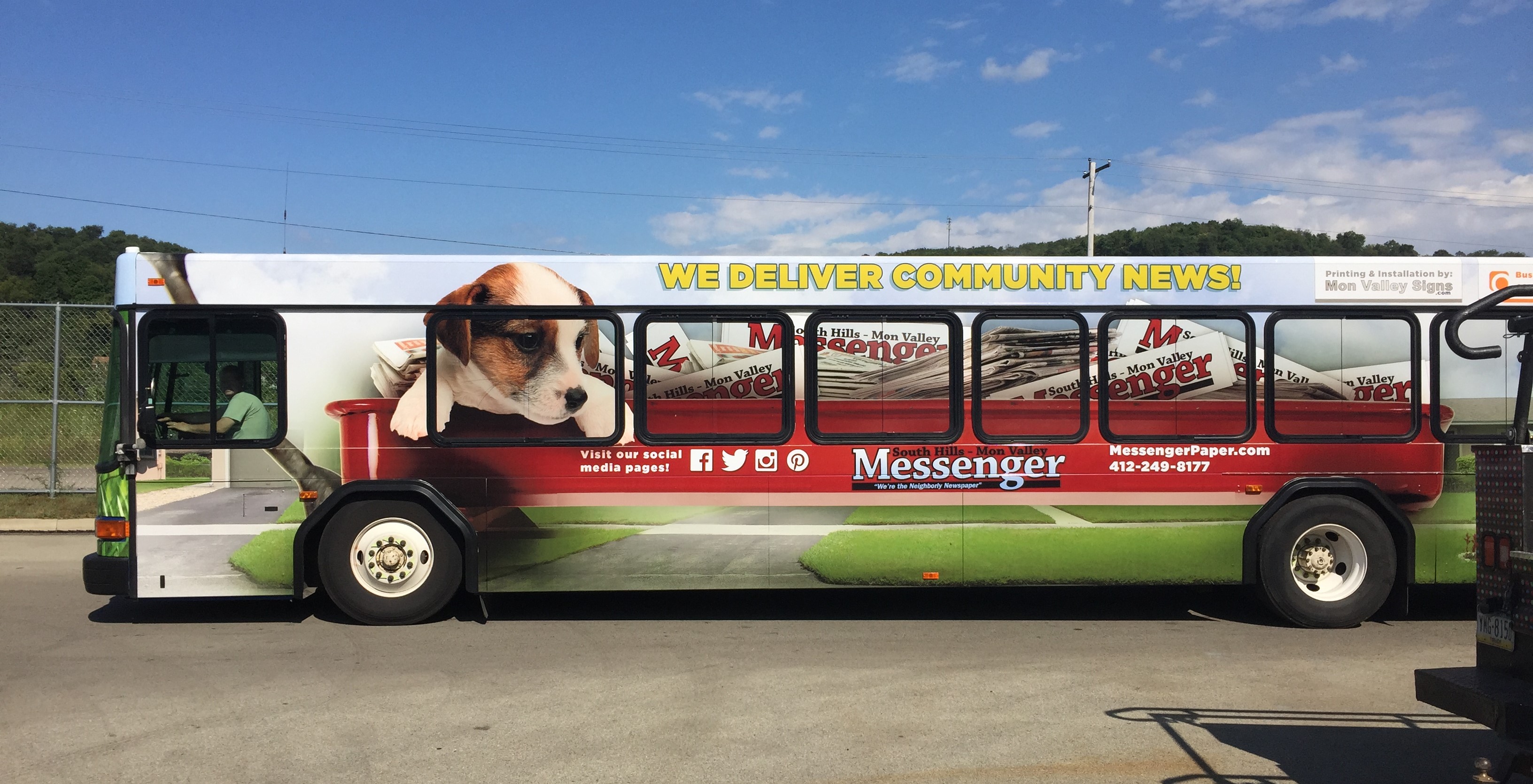 PITTSBURGH , PA , USA , September 30, 2015 /EINPresswire.com/ -- Months of work and a team effort by three South Hills companies has produced perhaps the area’s most unique transportation vehicle. A full size Mid Mon Valley Transit Authority bus has been completely transformed into a 40-foot long lawnmower on one side, and a red wagon on the other. The bus was covered by a full color vinyl wrap advertising the South Hills-Mon Valley Messenger, a community newspaper that services the South Hills of Pittsburgh. The graphics were designed by ocreations and produced by Mon Valley Signs. With a daily route that begins in Donora and travels through the South Hills into downtown Pittsburgh, the bus is seen by thousands in the area every day.After the newspaper changed their name to the South Hills-Mon Valley Messenger last year, they needed to re-establish their identity and chose transit advertising as one of their primary marketing tactics. “We wanted to get people to notice us,” said Doug Haniford, owner and publisher. “It was important for us to continue to position ourselves as a neighborhood newspaper with a hometown feel,” he said. “We felt like the old-fashioned wagon and other images on the bus helps bring that feel to life.”