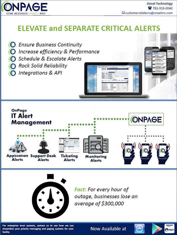 OnPage is the industry leading Smartphone application system for Global, High-Priority, Real-Time Enterprise Messaging, Cybersecurity Intrusion Compliance and IT Alert Management. The OnPage application addresses the need for critical incident response management and secure time-sensitive messages.