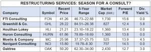 FTI (FCN), Huron (HURN) and Navigant (NCI) are management consulting firms that do a significant amount of work advising companies about restructuring. FTI, which we recommended in February, is well-known in the restructuring field. Restructuring work is a smaller, but still significant portion of revenues and profits for Huron and Navigant.