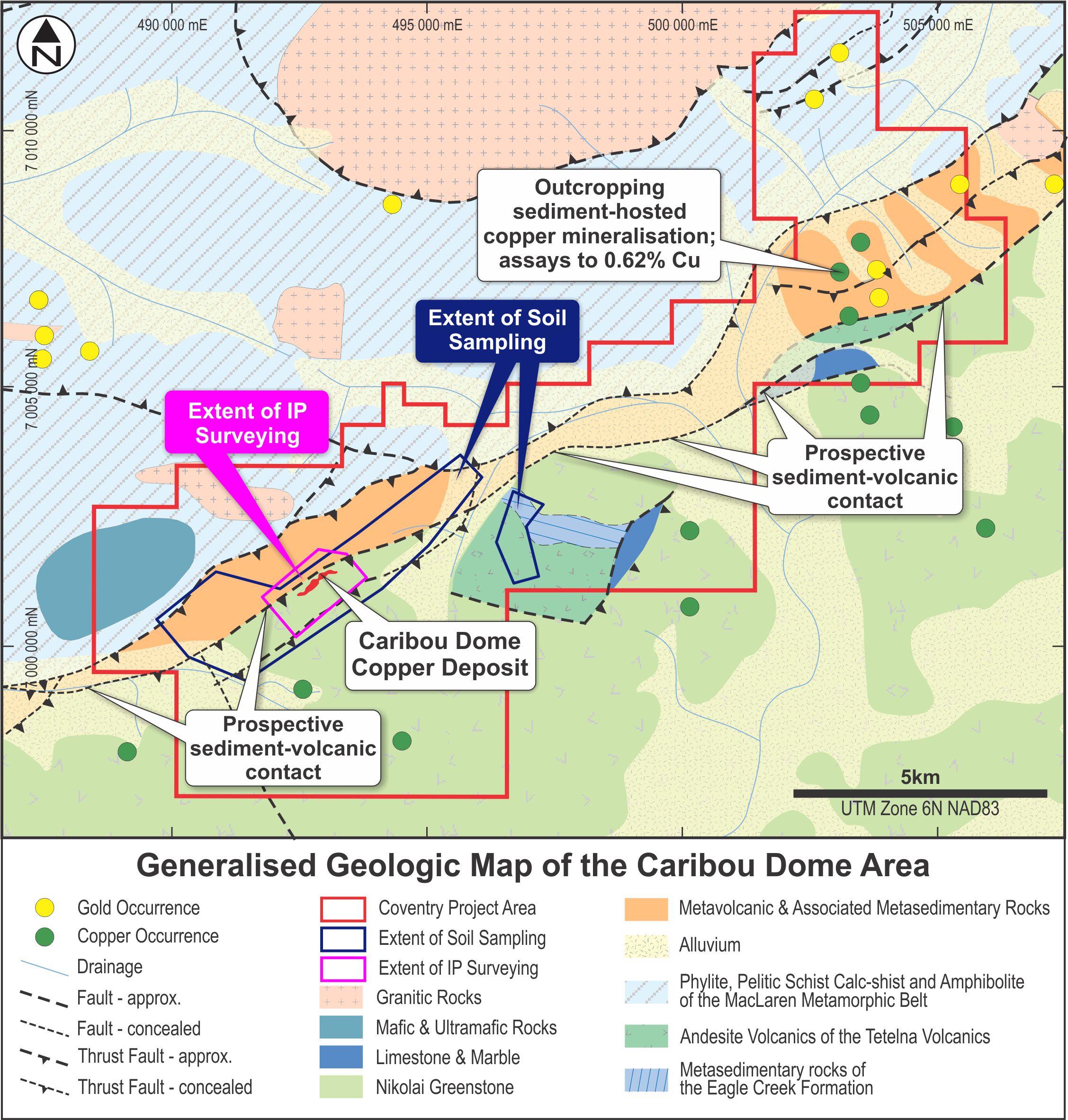 Figure 2. Regional geology of the Caribou Dome Copper Project - showing the prospective sedimentary sequence extends for greater than 15km within the Project area, but that much of this strike is yet to be covered with soil sampling and/or ground geophysical surveying.