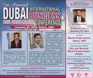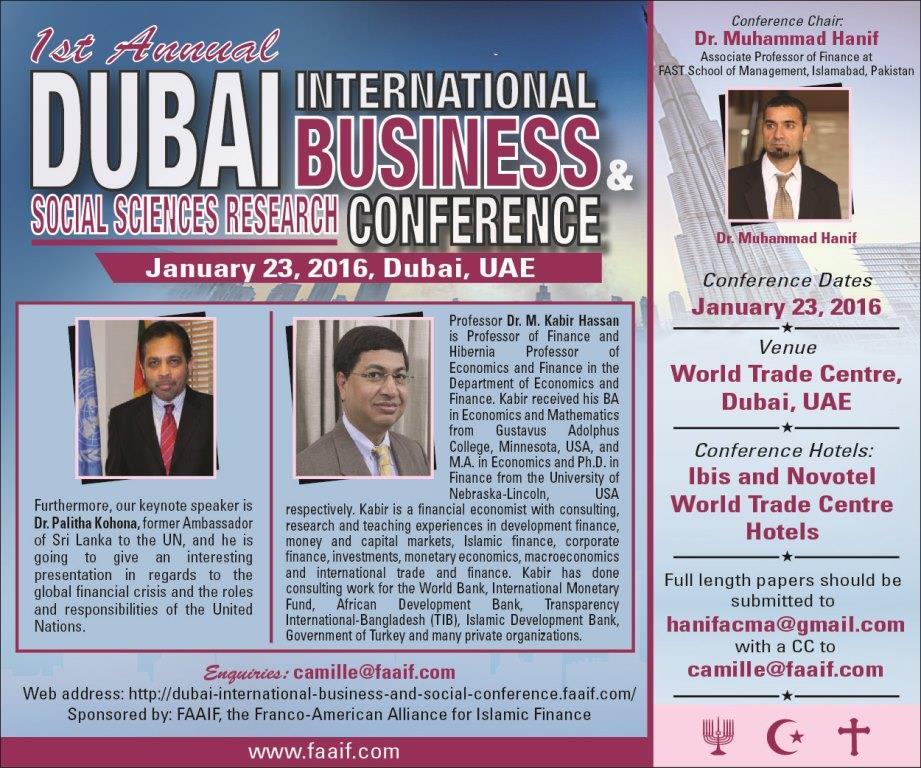 The Dubai International Business and Social Science Research Conference (DIBSRC) will be chaired by Dr. Muhammad Hanif, Associate Professor and hosts Keynote Speaker, Dr. Kabir Hasan, Hibernia Professor of Economics and Finance at University of New Orleans, USA. In this unique and exciting inter-faith finance and banking event, paper submissions are welcome on the topics of conventional and faith-based finance, banking, accounting, business, e-commerce, start-up funding, private equity, and venture capital. In addition, the financial system shall be explored including framework, ethics, continuity, and crisis. Full length papers should be submitted to hanifacma@gmail.com with a CC to camille@faaif.com.