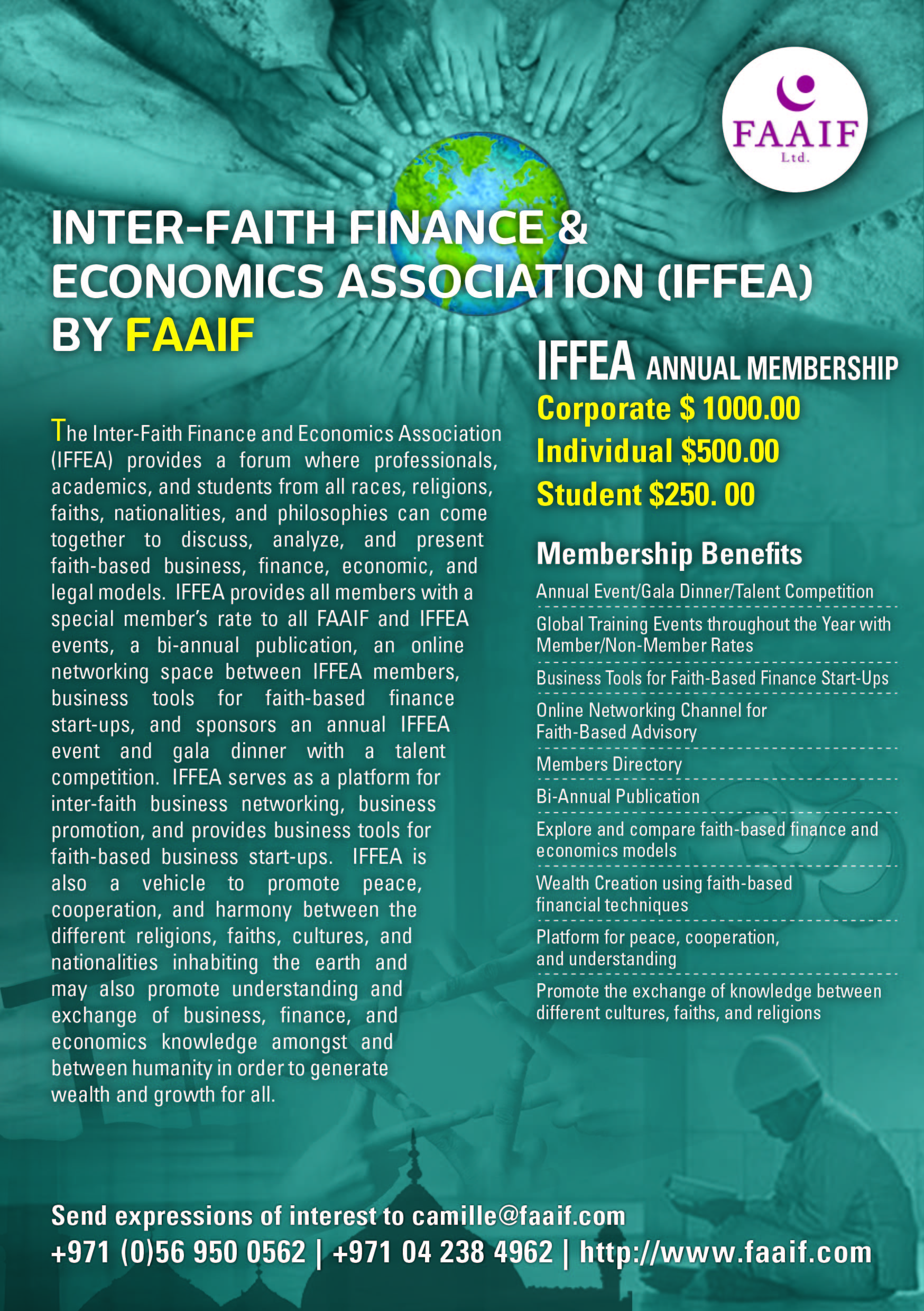 CEO of FAAIF, Camille Paldi, announces that the Inter-faith Finance and Economics Association (IFFEA) will be launched at the Dubai International Business and Social Sciences Conference in Dubai, UAE on Jan. 23, 2016. The purpose of IFFEA will be to promote the study, examination, analysis, discussion, and presentation of various faith-based modes of finance such as Christian, Jewish, and Islamic finance and economics as well as financial and economic principles found in the different religions, philosophies, and cultures from around the world. Paldi encourages people of all faiths, religions, nationalities, and cultures to come together in future IFFEA events in order to discuss and compare financial and economic paradigms, problems, and solutions.
