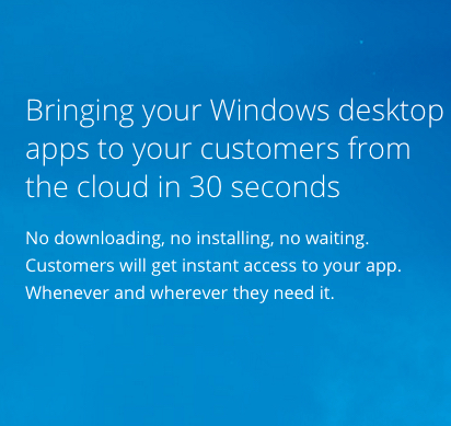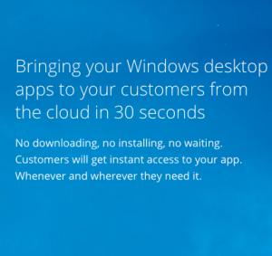 Software vendors have now a new way of bringing their Windows desktop software to customers from the cloud in 30 seconds. The customers will get instant access to the vendor's software of their choice whenever and wherever they need to use it, i.e. on Macs, iPhones, tablets, Windows desktops or Android smartphones. The users are welcome to trial or buy the apps instantly, and then pay for them on a monthly basis.