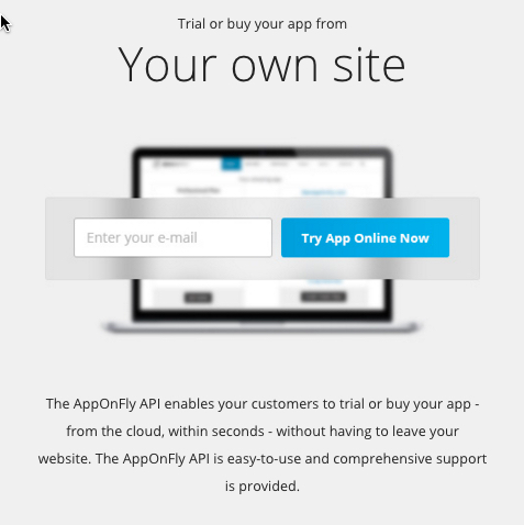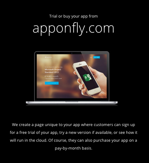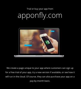 Apponfly creates a page unique to the vendors‘ sotware offering where their customers can sign up for a free trial or see how the software will run in the cloud. When the trial period expires the users can subscribe to the particular software on a pay-by-month basis.