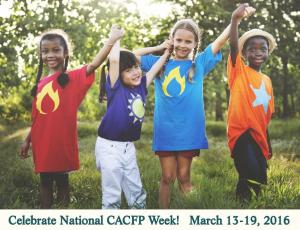 AUSTIN, TX, USA, March 8, 2016 /EINPresswire.com/ -- Next week, the Child and Adult Care Food Program (CACFP) Community will work together to tell their story about the thousands of people working tirelessly every day to combat hunger and bring healthy foods to the table for adults in day care and children in child care homes, centers, and in afterschool and summer feeding programs across the country. Organizations which participate in the CACFP provide 1.96 billion meals and snacks to 3.5 million children and elderly or disabled adults at a cost of $2.87 billion in federal funding.CACFP Week is a national education and information campaign sponsored annually by the National CACFP Sponsors Association (NCA). The campaign is designed to raise awareness of how the USDA's Child and Adult Care Food Program works to combat hunger and bring healthy foods to the table for adults in day care and children in child care homes, centers, and in afterschool and summer feeding programs across the country. Join the National CACFP Sponsors Association (NCA) in raising awareness across the nation from Capitol Hill, to State Legislators, to members of your local community during National CACFP Week March 13-19, 2016. Free promotional resources available at www.cacfp.org.