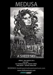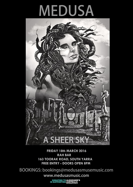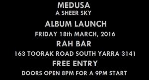 MEDUSA will launch her first solo album A SHEER SKY on 18th March 2016 at the RAH BAR in South Yarra. Supporting and raising awareness for Alzheimer’s Australia Dementia Research Foundation.
