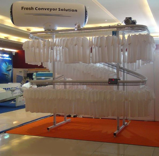 Garment conveyor takes less space than ordinary cloakrooms by times. Free space can be used in other purposes.