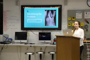 January 2016: Sabina Y. pitches her idea for a new type of enhanced scoliosis brace, called the "EmBrace."