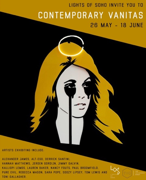 LONDON, LONDON, UK , May 16, 2016 /EINPresswire.com/ -- LIGHTS OF SOHO PRESENTS CONTEMPORARY VANITAS CURATED BY LEE SHARROCKLondon’s leading light art gallery is pleased to announce their next show in collaboration with Lee Sharrock, Contemporary Vanitas, a look at vanity and mortality. Featuring 16 contemporary artists, the exhibition, which launches 26th May, will showcase the artists own interpretations of the Vanitas and features iconic memento mori symbols such as skulls, butterflies, and fruit, as well as more abstract interpretations in the form of celebrity portraiture and the written word in the form of neon.