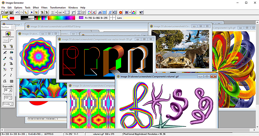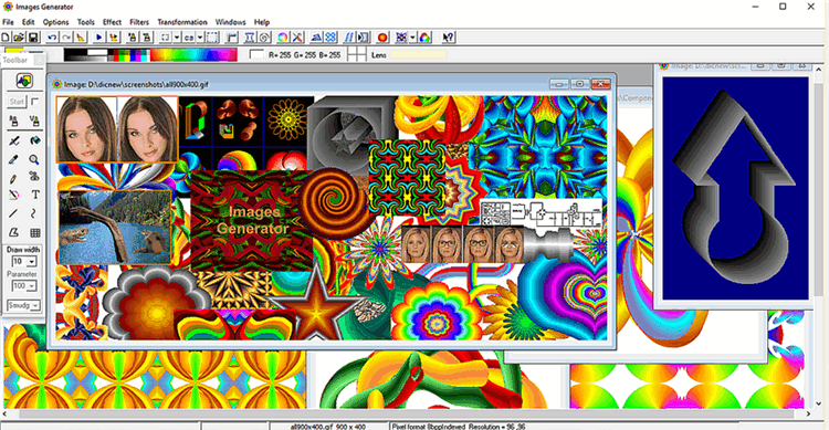 Images Generator pretend to be the workhorse for ordinary users and is useful addition to the toolkit of professional artists and designers. The program is mean for developing of creative abilities. It can be used as developing toy for children.