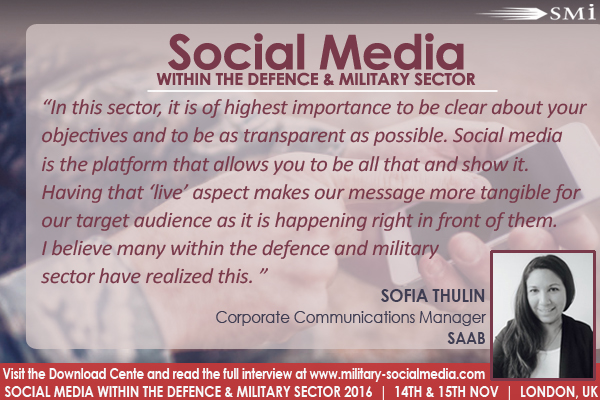 In the run-up to the event, SMi Group spoke to Sofia about Saab’s effective use of social media. “As a company and not armed forces, our goal is to increase the awareness of what we stand for and what we do. We ourselves are not the ones that are out in the field but we are a proud provider of solutions that armed forces and civilian authorities use. This is something vendors want, but also at times need, to communicate to the public. With the technological developments and more people engaging, social media is a good way to do this.”