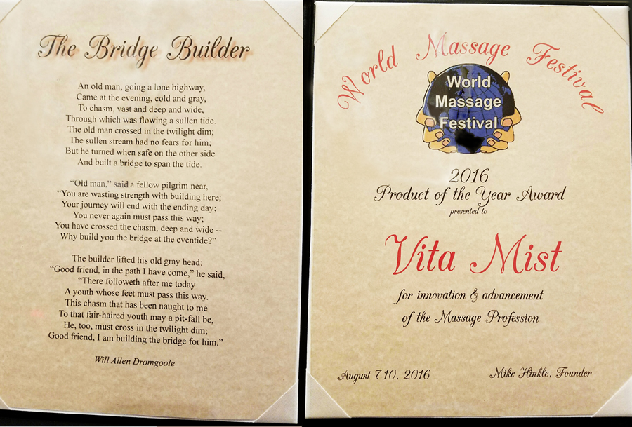 VitaMist is honored to receive the 2016 Product of the Year Award from an organization as caring, reputable and charitable as The World Massage Festival. VitaMist supports their mission, and looks forward to many more years of making people healthy.
