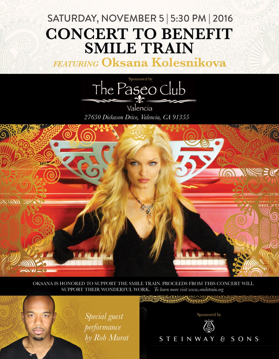 VALENCIA, CA, UNITED STATES, September 12, 2016 /EINPresswire.com/ -- LOS ANGELES, CA - To help children born with cleft lips and/or palates, concert pianist/composer Oksana Kolesnikova is scheduled to perform a special benefit concert at Paseo Club in Valencia on Saturday, November 5, 2016.Smile Train, an organization providing free cleft repair surgery and comprehensive cleft care for children will be the concert beneficiary. For each ticket sold, $50 will be donated to Smile Train to help provide new smiles and opportunities for children with clefts. This life-changing surgery and associated care will help change a child's life by giving them the ability to eat, breathe, speak, and smile.