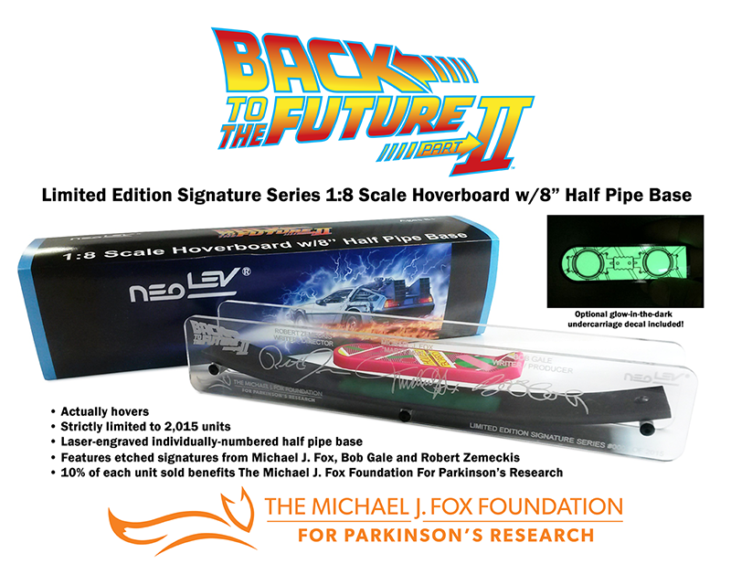 BacktotheFuture.com partnered with NeoLev® for exclusive distribution of their Limited Edition Signature Series. Sporting laser-engraved signatures of actor Michael J. Fox, and filmmakers Bob Gale & Robert Zemeckis — co-creators of the Back to the Future Trilogy, the Signature Series also includes an exclusive “Glow-in-the-Dark” optional undercarriage decal for the miniature replica of Marty McFly’s Hoverboard as depicted in the 1989 sequel Back to the Future Part II. The Signature Edition series is strictly limited to a production quantity of 2,015 laser-engraved individually-numbered units, with 10% of the proceeds of each unit sold earmarked specifically to benefit The Michael J. Fox Foundation for Parkinson’s Research.