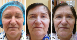 A 62-year-old female received RecoSMA facial treatment with the 2936-nm Er:YAG laser system equipped with SMA module. (A) Baseline (B) one month (C) six months after treatment