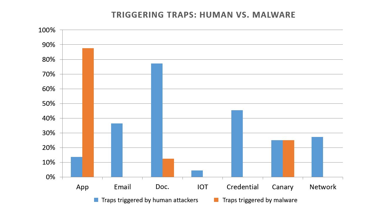 - For the most popular traps triggered by human attackers, 77 percent of participants triggered document traps set in the enterprise environment. Next, 45 percent of the hackers triggered credential traps, consisting of usernames and passwords in files, directories and emails; followed by 36 percent who triggered email traps. In addition, human attackers also reached network, application and IoT-based traps.