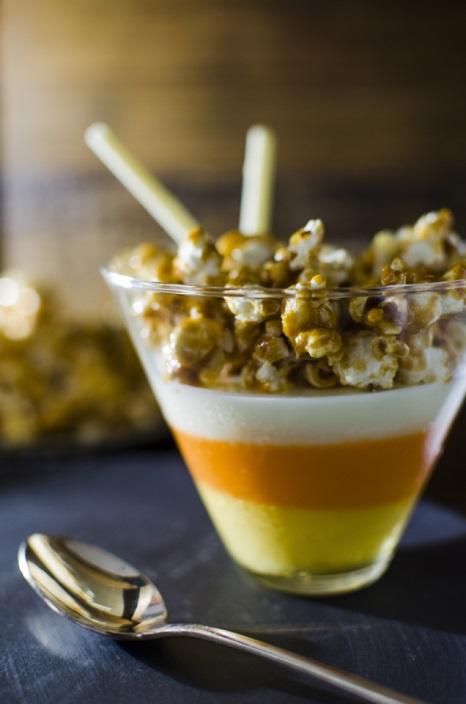 Caramel corn-topped candy corn panna cotta