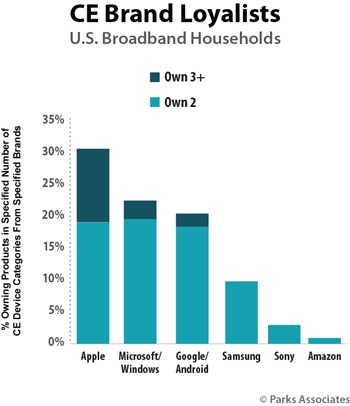 DALLAS, TX--(Marketwired - Nov 29, 2016) - New research from Parks Associates finds smart home solutions that coordinate safety and home/away event scenarios could help a device manufacturer create cross-platform brand loyalty similar to Apple's dominance in CE device ecosystems. The IoT research firm finds U.S. consumers are more likely to own multiple CE products from Apple than from any other CE brand, with loyalty based largely around its mobile platforms. The emerging smart home markets do not have a dominant cross-platform player yet and represent an opportunity to establish a new population of brand loyalists.
