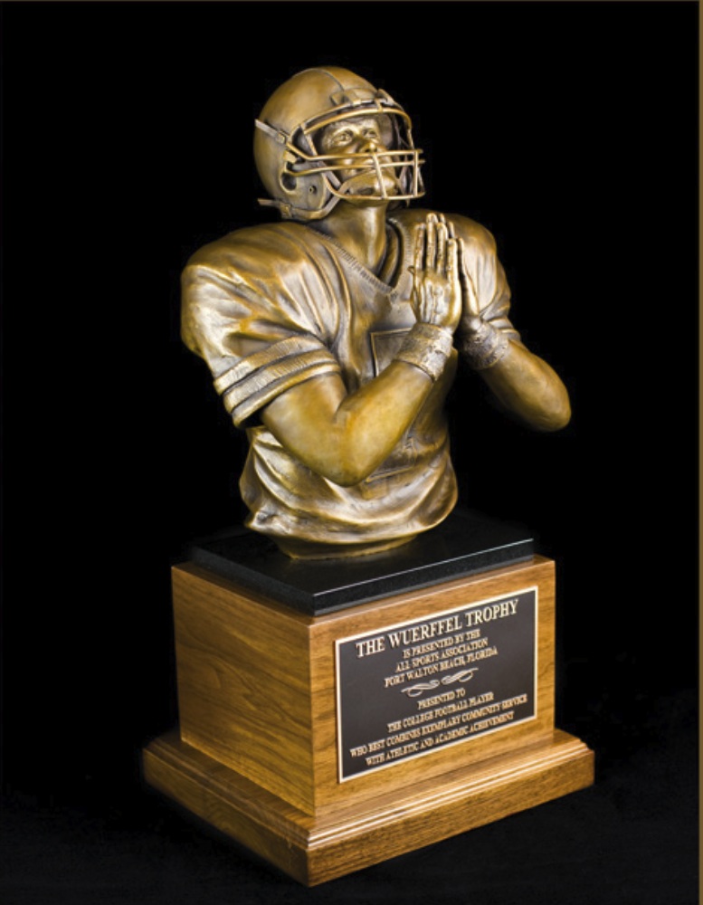 The Wuerffel Trophy is college football's premier award for community service. The All Sports Association, based in Fort Walton Beach, Florida, presents the Wuerffel Trophy to the Football Bowl Subdivision player who best exhibits exemplary community service, along with qualifying academic and athletic achievement. As the trophy namesake, Danny Wuerffel, former Heisman Trophy winner from the University of Florida who had a six year career as quarterback in the National Football League, embodies the three categories of the award: community service, academics and athletics. Past winners of the Wuerffel Trophy include: Ty Darlington, University of Oklahoma (2015); Deterrian Shackelford, University of Mississippi (2014); Gabe Ikard, University of Oklahoma (2013); Matt Barkley, University of Southern California (2012); Barrett Jones, University of Alabama (2011); Sam Acho, University of Texas (2010); Tim Hiller, Western Michigan University (2009); Tim Tebow, University of Florida (2008); Paul Smith, University of Tulsa (2007); Joel Penton, Ohio State University (2006); and Rudy Niswanger, Louisiana State University (2005). The Wuerffel Trophy is a member of the National College Football Awards Association, which encompasses the most prestigious awards in college football. The 23 awards boast more than 700 years of tradition-selection excellence. For more information, go to www.NCFAA.org and www.wuerffeltrophy.org.