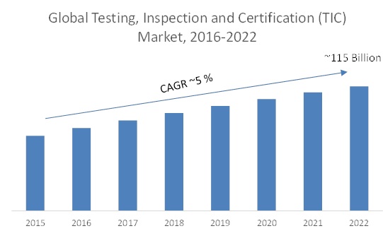 The global market for Testing, Inspection & Certification (TIC) market is expected to grow over the CAGR of around 5% during the period 2016 to 2022 and expected to grow at market size of USD 115 billion in 2022.