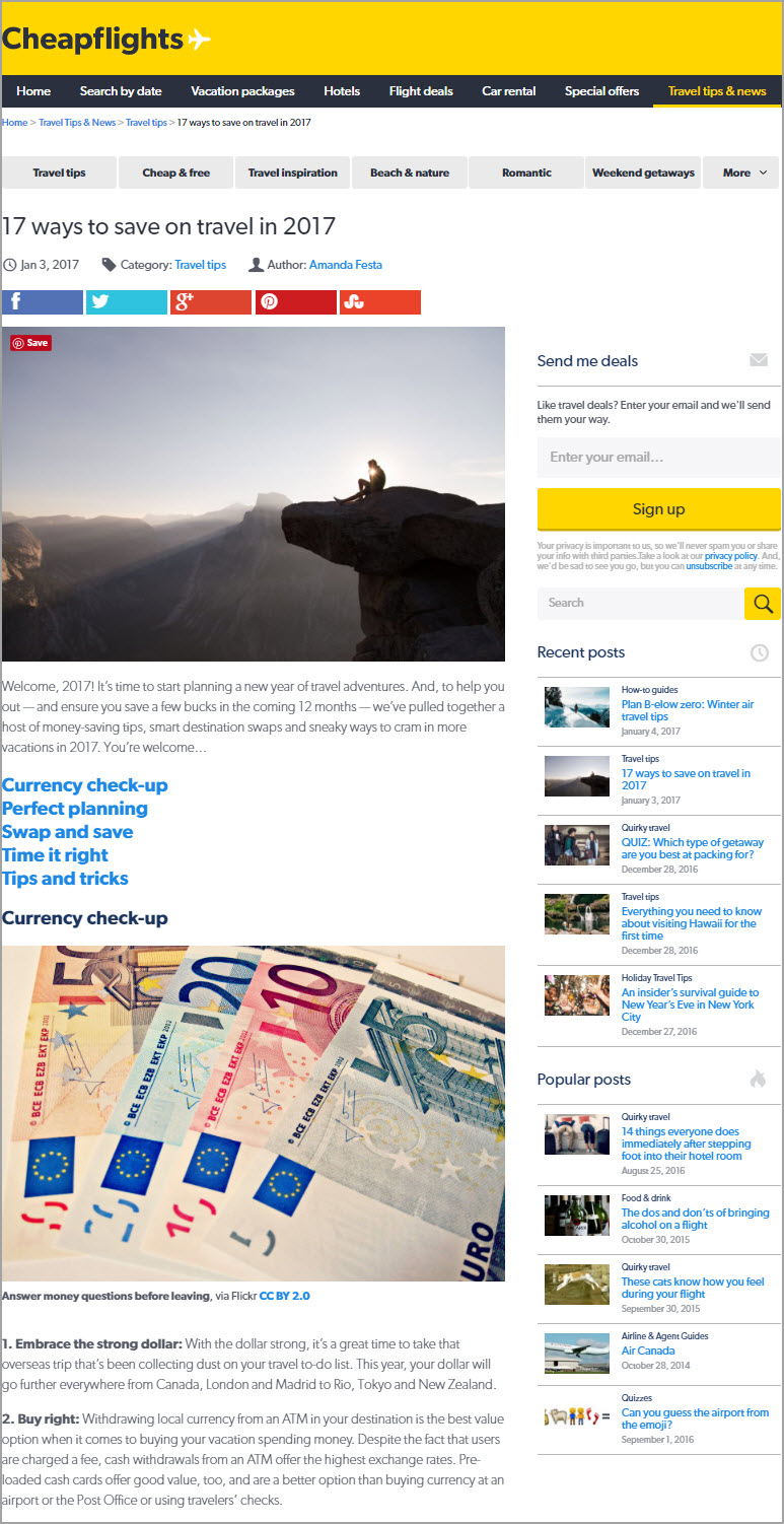 Cheapflights.com blog post on 17 Ways to Save on Travel in 2017. Now that the holiday decorations are down and winter break is over, many of us are turning our attention to planning our spring getaways, summer vacations and winter holidays in 2017. For money-saving tips, smart destination swaps and sneaky ways to cram in more vacations in 2017, check out this insiders’ guide from Cheapflights.