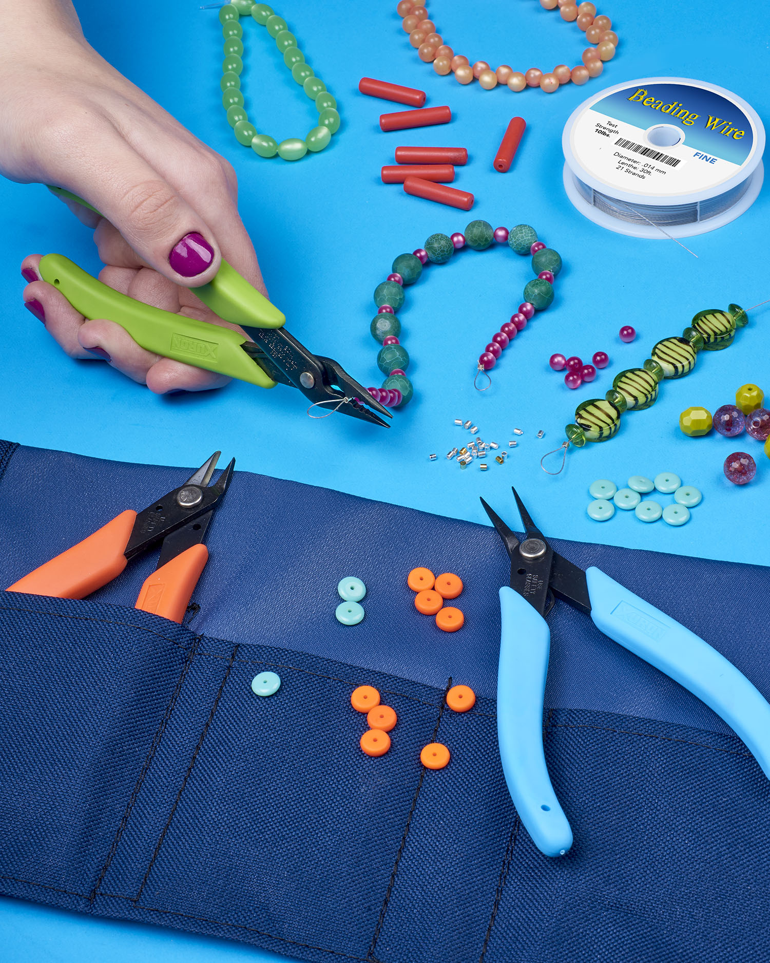 The Xuron® TK2600 Bead Stringer's Tool Kit includes the Model 410 Micro-Shear® Flush Cutter for cutting soft wire up to 18 AWG (1 mm), Model 450 TweezerNose™ Pliers for grasping, bending, and forming wire, and the Model 494 4-in-1 Bead Crimper with three folding stations for 1, 2, and 3 mm crimp tubes and includes a chain nose plier tip for holding, squeezing, and picking up small beads and findings.