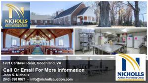 FREDERICKSBURG, VA, UNITED STATES, February 6, 2017 /EINPresswire.com/ -- Nicholls Auction Marketing Group, Inc., (www.nichollsauction.com) announces the auction of a solid and well-maintained commercial building with a commercial kitchen, road frontage and ample parking on 9.2+/- acres in desirable Goochland County on February 17th at 10 am according to John Nicholls, president of the company.— John Nicholls