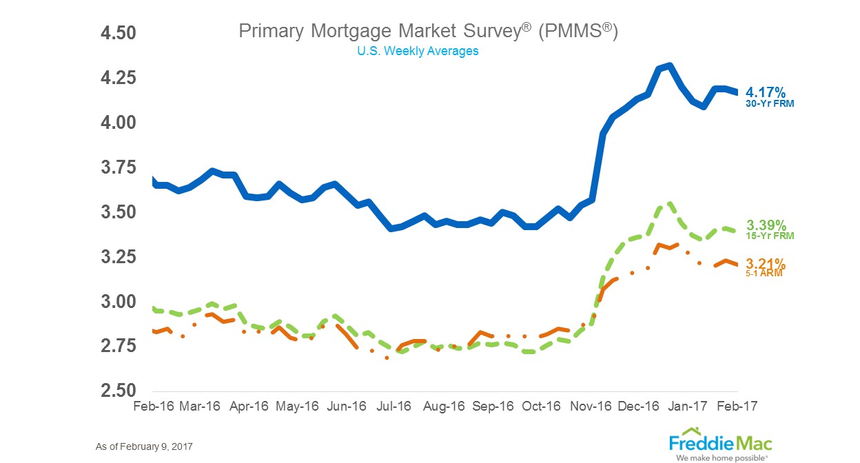 - 30-year fixed-rate mortgage (FRM) averaged 4.17 percent with an average 0.4 point for the week ending Feb. 9, 2017, down from last week when it averaged 4.19 percent. A year ago at this time, the 30-year FRM averaged 3.65 percent.