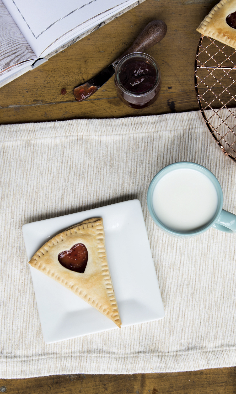 Using a small heart-shaped cutter cut a heart out of each of the remaining eight pastry wedges (discard the hearts) and arrange on top of the jam-filled wedges. Press the edges with the tines of a fork to seal.