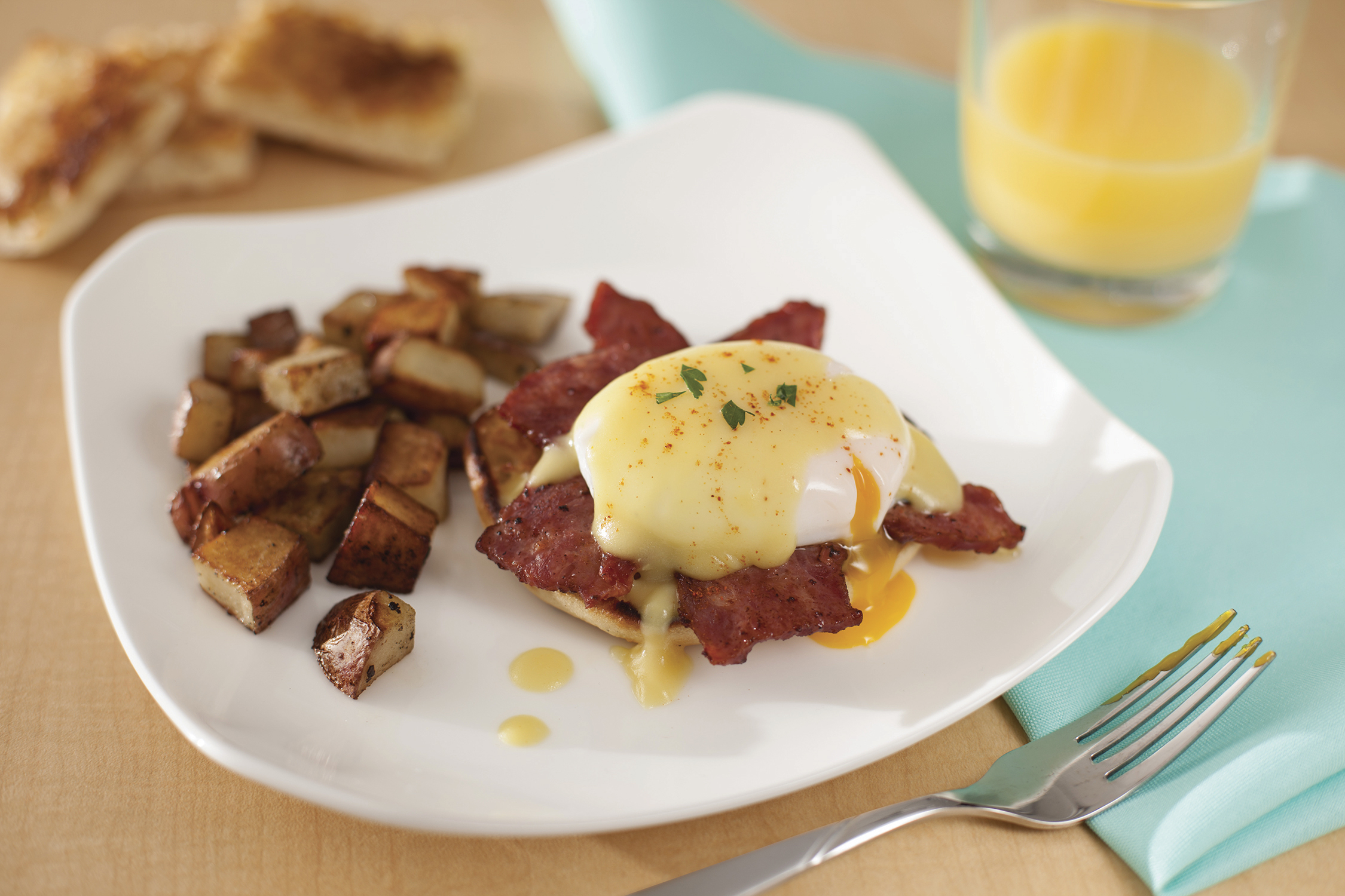 For an exciting added element, use duck bacon with this version of classic Eggs Benedict. This brunch recipe feeds a crowd and is ready in less than 30 minutes, making it the perfect choice when you want to whip up a quick entree for family or friends.