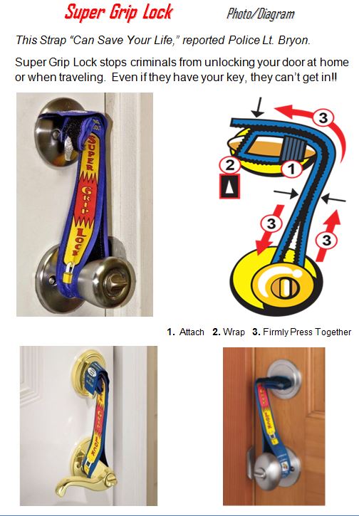 An Oregon mom took on the task and invented Super-Grip-Lock an adjustable deadbolt Strap that locks-down the deadbolt handle and stops anyone from unlocking that door: