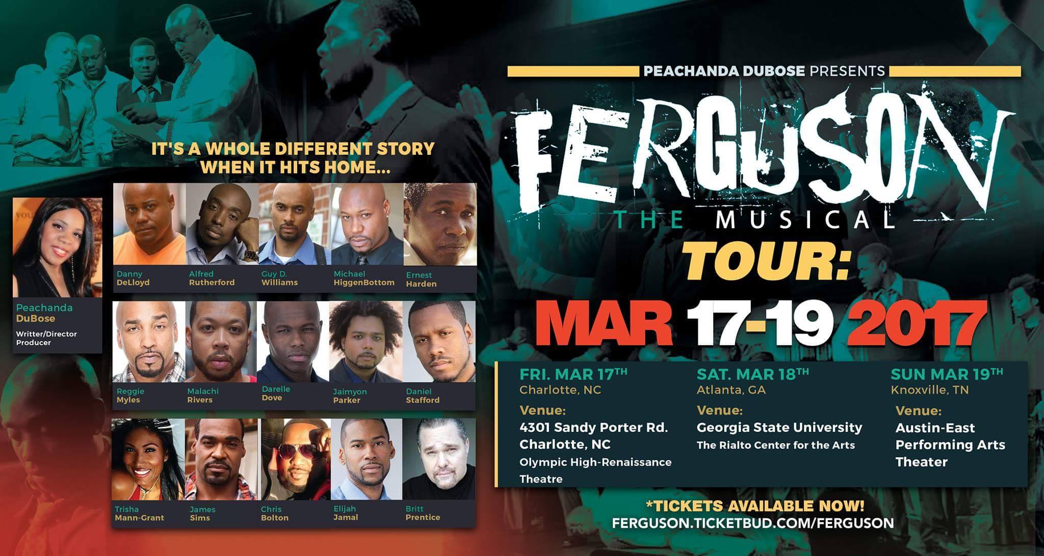 ATLANTA, GEORGIA, UNITED STATES, March 14, 2017 /EINPresswire.com/ -- While America is reeling from the latest rounds of African- Americans killed by police officers in Tulsa, Oklahoma, and Charlotte, North Carolina, "FERGUSON" The Musical, a Hit Production, loosely based on an incident from two years ago in Ferguson, Missouri, is headed on tour to Charlotte, Atlanta, and Knoxville Tennessee.The play was inspired by the murder of Mike Brown, (and many other cases like his) an unarmed black teenager who was shot and killed August 9, 2014, by police, sparking nationwide protests and civil unrest in Ferguson, Missouri, a suburb of St. Louis. On November 24th of that same year, a grand jury decided not to charge Darren Wilson, the cop who killed Brown. That news set off even more national protests.