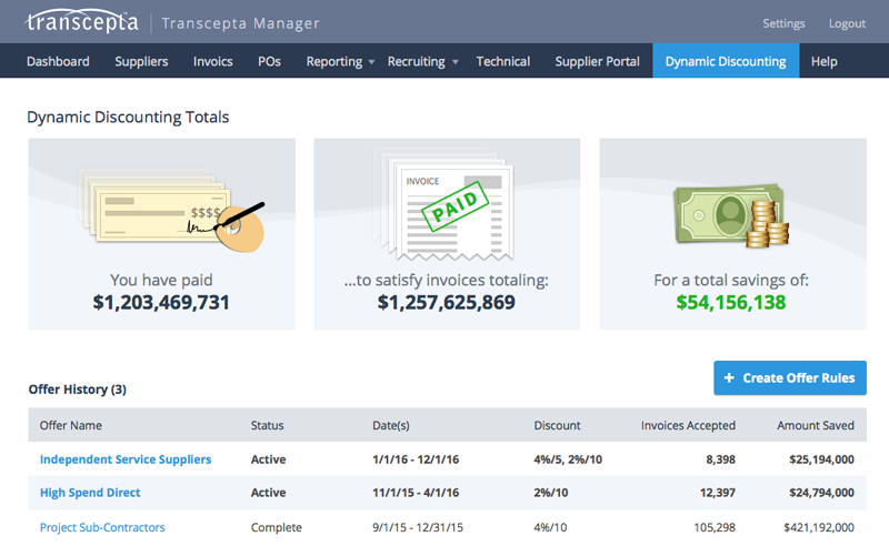 Transcepta's Dynamic Discounting is a smart solution that offers buyers and suppliers more control to optimize profit and cash flow. It allows businesses to pay early and enjoy supplier discounts, with the ability to determine which suppliers are most likely to accept discount offers and when they are most likely to accept them.