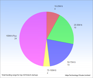 The majority of the startups (48%) in top-50 have raised more than $100 M in total funding. It is understandable as most of these startups are in direct competition with the big financial institutions, even though they are few years old, their customer service and security standards have to be at par with the big wigs.